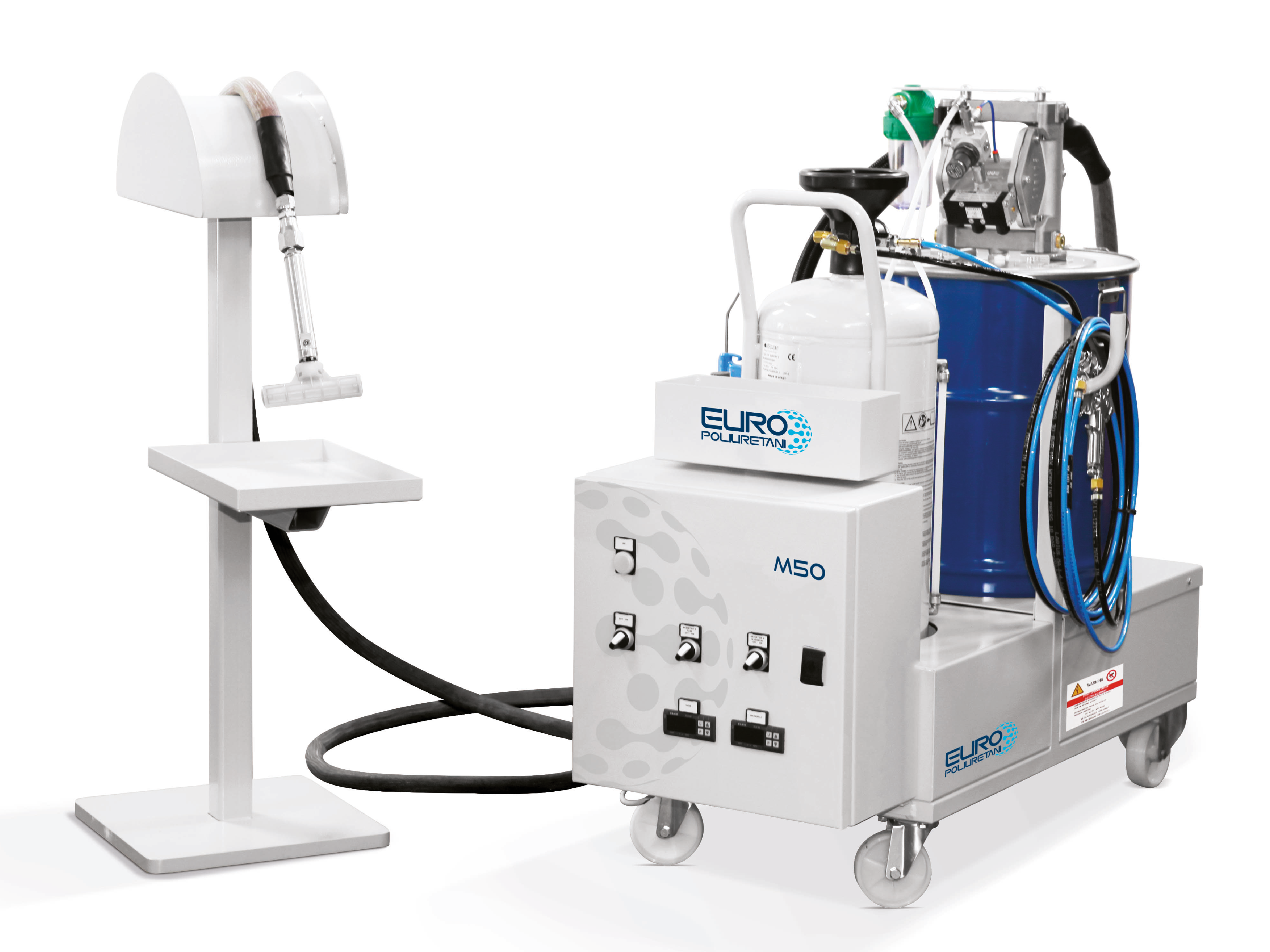 Formados por un bastidor de acero al carbono que contiene el sistema de carga, el bidón de producto químico y el cuadro électrico. El sistema de carga extrae el producto químico del bidón y envía el fluido al dosificador